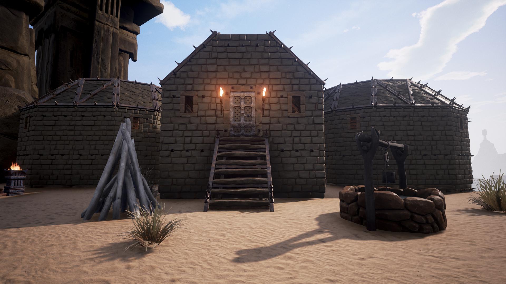 <p>Der rechte Rundbau ist die Eisen- und Stahlschmelze, der links Rundbau dient zu Sandstein- und Ziegelschmelze. Der dritte Rundbau im Hintergrund (nicht sichtbar) ist die Werkstatt. Der vordere Bereich ist der Eingangsbereich.</p><p>Dies ist ein zwei stöckiges Haus. Unten befindet sich der persönlich Wohnraum, die Waffenkammer und die Ressourcenkammer. Der Durchgang dazu führt über den Eingangsbereich mit einer Treppe.</p>