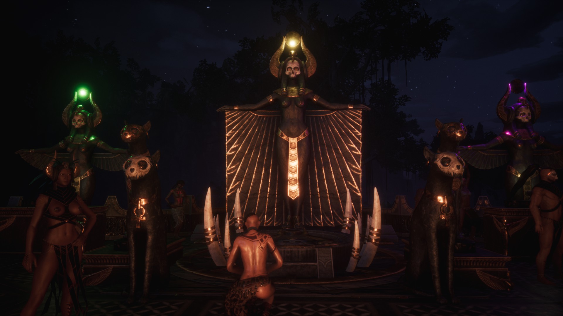 <p>Im Zuge der laufenden Quest haben die Derketoanhängerinnen einen Ruf durch Derketo selbst erhalten und sind diesem zum Schrein im Dschungel gefolgt. Derketo selbst hat sich an diesem Abend gezeigt und mit ihren Anhängerinnen gesprochen + eine Vision offenbart um in eine bestimmte Richtung zu lenken. Heimliche Beobachter gab es natürlich auch <img src="https://conanexiles.zone/community/images/smilies/emojione/1f608.png" alt="