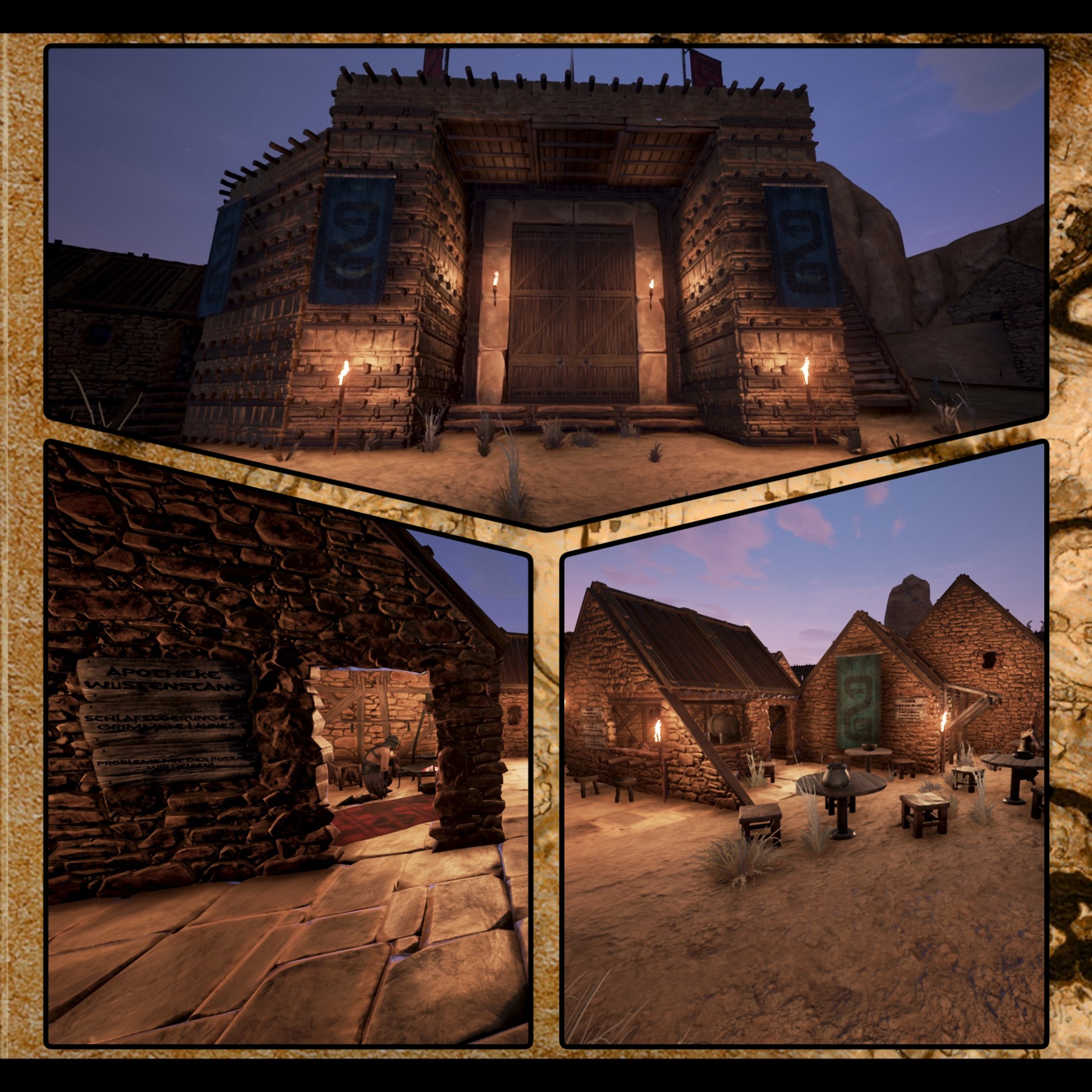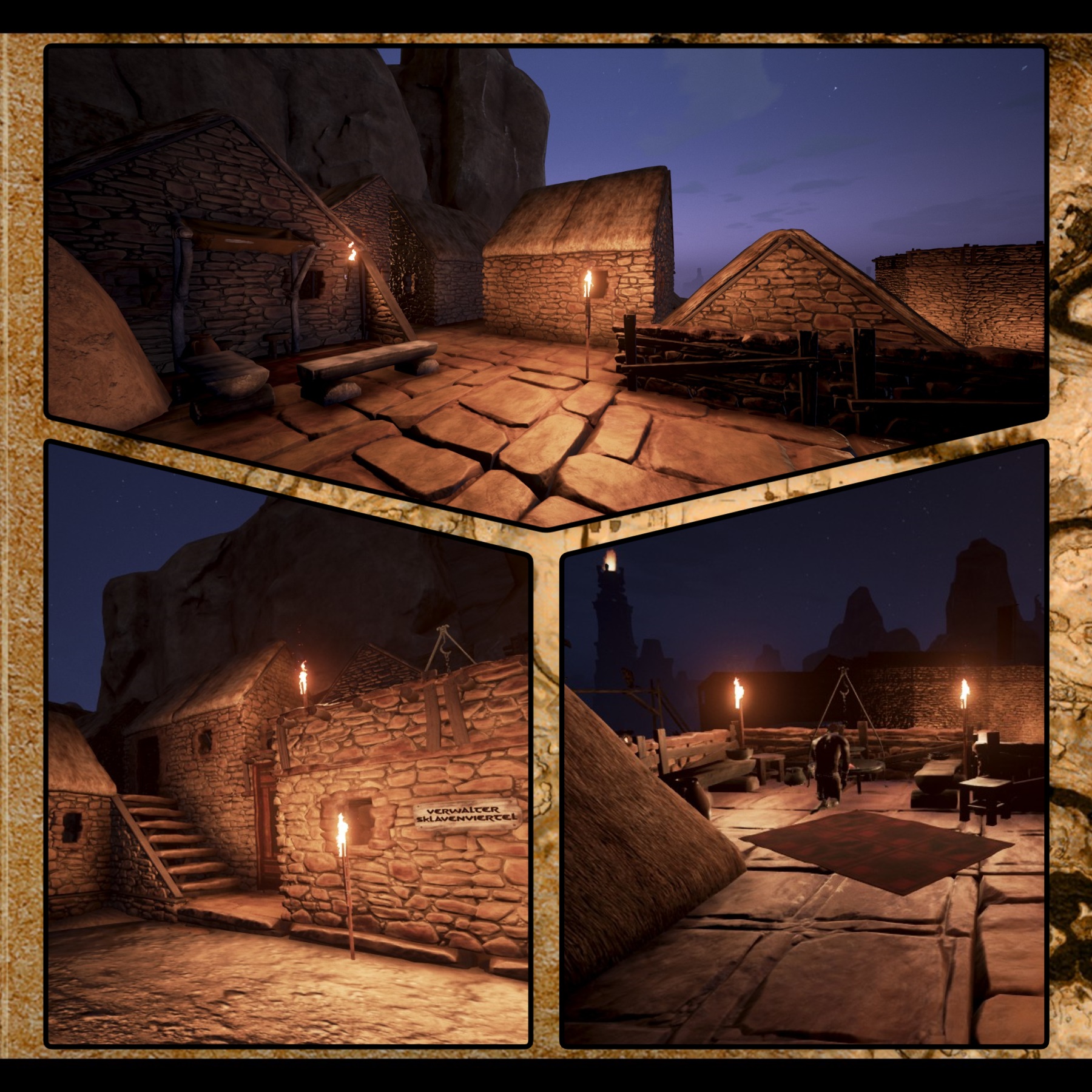 Langsam ließ Pueros seinen Blick durch die Halle streifen. Er hielt kurz bei den Tänzerinnen inne und betrachtete ihren schwungvollen Tanz zu seinen Füßen. Nun ihm gefiel was in den letzten Monaten alles so geschehen war. Langsam richtete er sich auf und stieg die Treppen von seinem Podest hinab mitten in die Methalle. „Es muss doch in dieser verfluchten Wüste irgendwie möglich sein an Met zu kommen“, dachte er bei sich als er gemütlich durch die Halle ging. Er ging bis zum Eingang der riesigen Halle und öffnete die Tür. Draußen schlug ihm der heiße Wüstenwind entgegen, an den er sich einfach nicht so richtig gewöhnen konnte. „Ach du schöne Heimat wie kühl es doch immer bei dir war“, ging ihm durch den Kopf als er sich an sein Dorf mitten in den Cimmerischen Gebirge erinnerte. „Doch was solls“, dachte er weiter und ging weiter bis zur Dorfmitte. Schon auf dem Weg dorthin schlug ihm das geschäftige Treiben der Kaufleute, Zimmermänner, Sklaven und vielen anderen Stimmen entgegen. Nun so klein auch alles angefangen hatte, so langsam konnte man schon von einer richtigen kleinen Stadt sprechen. Auf den Zinnen patroulierten, die Wachen am Sklavenrad stöhnten die Sklaven und überall hallte der Lärm von den neu enstehenden Gebäuden einem entgegen.