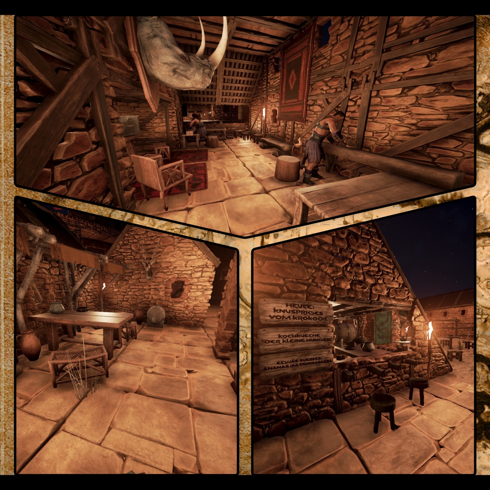 Doch so schön der Ort auch war, lag er eben nicht Ideal und so machte ich mich auf einen guten Ort zu finden und da war er. Ideal gelegen uneinnehmbar, unbezwingbar, einmalig. Unser neues Heim. So beschwingt machte ich mich auf den Rückweg als ich eine gebräunte Gestalt in einer Oase erblickte. Leise vor sich hin kichernd kam der Mann auf mich zu. Ständig erzählte er irgendetwas von einer Schlange Set die ihm wohl irgendetwas befohlen hätte. Der Mann musste in der Sonne wohl seinen Verstand verloren haben. Ich reichte ihm also ein Stück Fleisch und gab ihm etwas zu Essen. Das schien dem Mann zu Gefallen, denn seitdem folgte er Pueros auf Schritt und tritt. Eines Tages die beiden waren gerade auf Jagd, während Leira die neue Methalle von ein paar Sklaven bauen ließ, waren Pueros und Khitain, so hieß der komische braune Kerl nämlich, auf der Jagd, als Khitain eine wie sich rausstellte Set Priesterin fand. Er packte sie am Arm ging mit ihr zu mir und sagte: „Die kommt mit!“ Etwas sprachlos ließ ich es geschehen, keine Ahnung warum, denn eigentlich war sie ihm auch etwas Unheimlich. Aber so kam es, dass sie blieb was ihn ebenfalls verwunderte. Wüstenblume war ihr Name. „Na immerhin ist der Name schön“, dachte er. Aber gut. Das Dorf wuchs eh an dem neuen Ort und immer mehr Menschen kamen und blieben. Eines Abends, Pueros folgte mal wieder dem ganzen Tag einer Spur eines Nashorns, da sah er ihn. Einen komischen Typen mitten am Feuer raufend mit einem Strauß. Mit bloßen Händen riss er ihm den Kopf ab und lachte blutverschmiert. Ein grinsen lief über Pueros übers Gesicht. Erinnerte ihn der Nordmann doch an seine guten alten Tage in der Heimat. Lächelnd ging er zu ihm und bot ihm eine neue Heimat an und so beschloss der Nordmann Yorik ein Teil der Gemeinschaft zu werden.