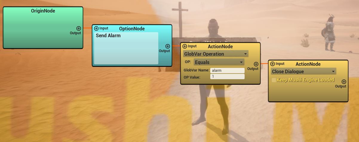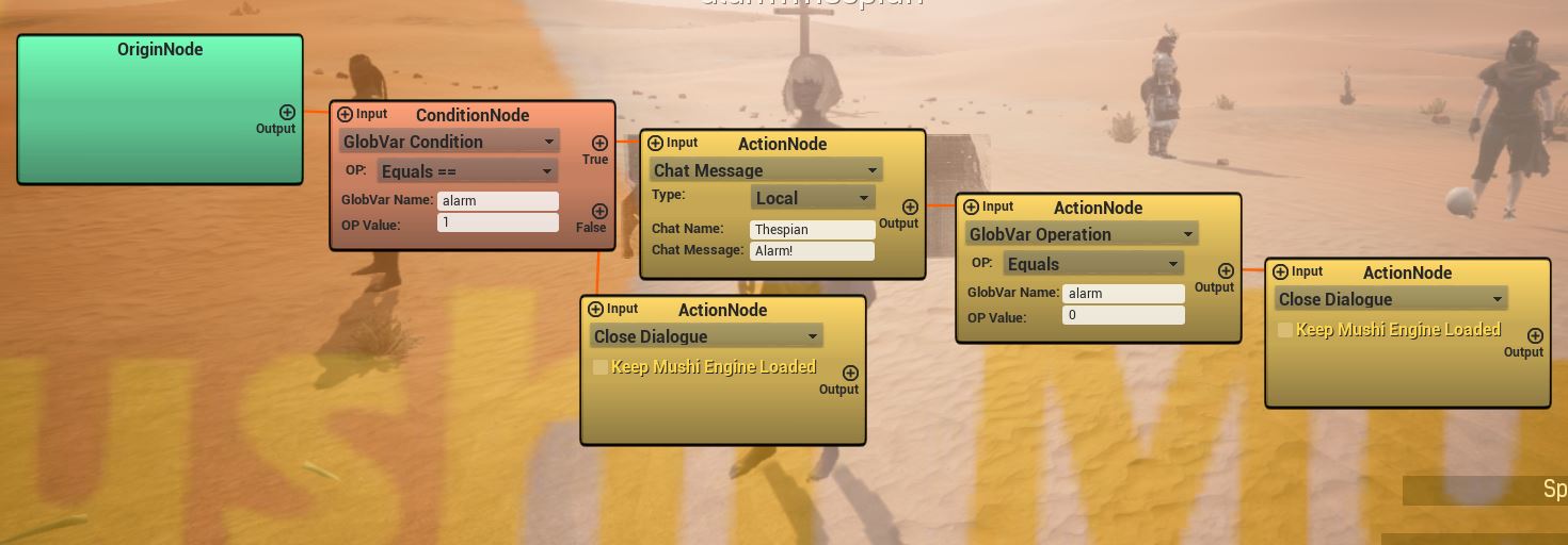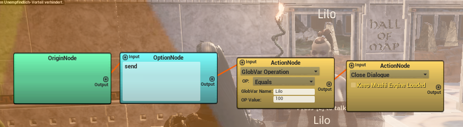Beispiel: Thespian 1 hat eine Dialog Option, die zu einem ActionNode geht, welcher eine GlobVar auf einen bestimmten Wert setzt.