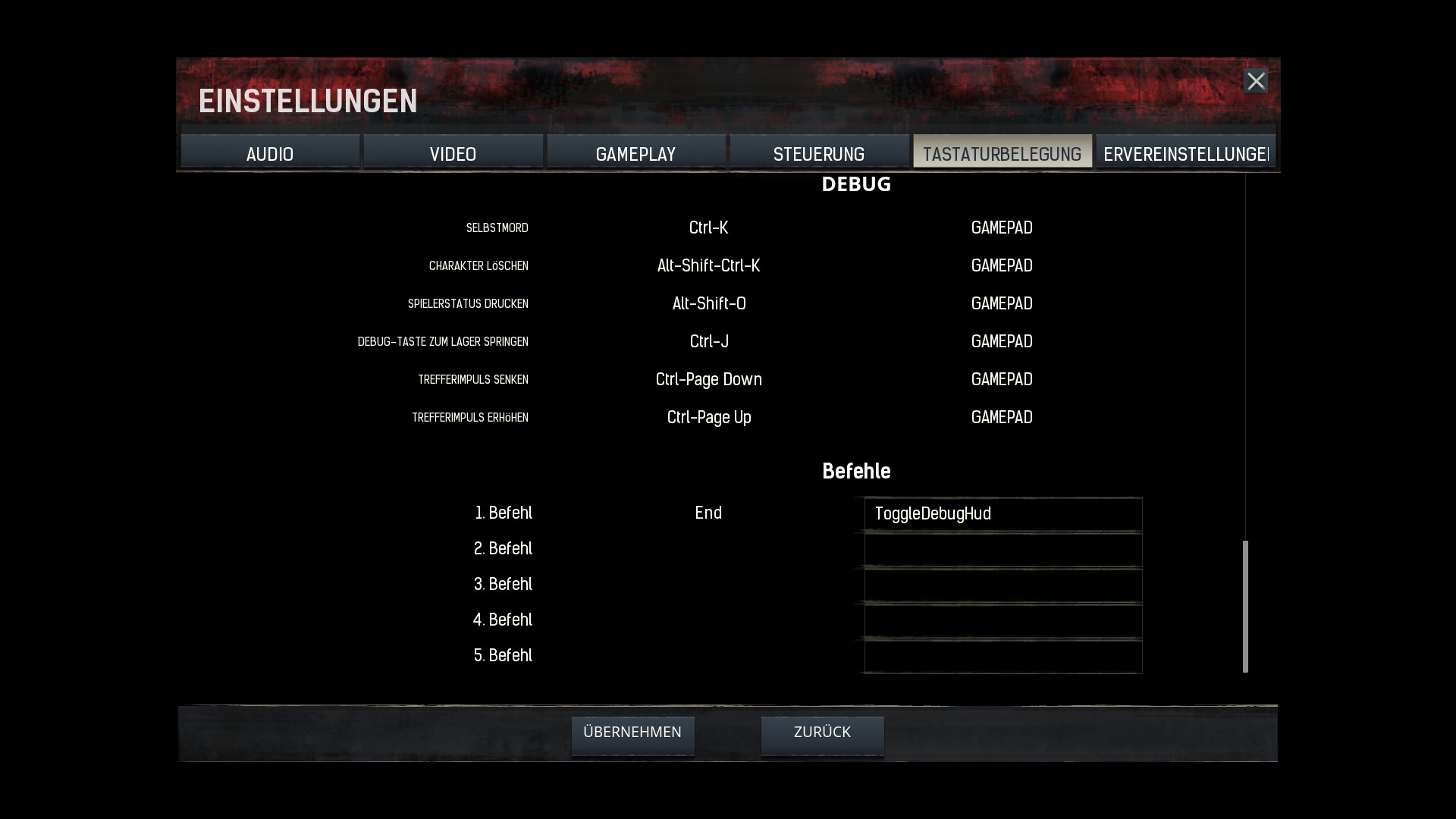 Ganz unten findet ihr fünf Zeilen bei welchen ihr auf der rechten Seite die Befehle eingeben und auf der linken Seite die Taste zuweisen könnt.
