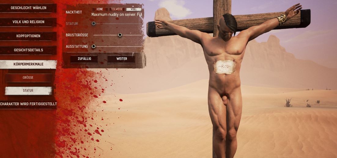 Was für viele Spieler zu Anfang eine lustige Anpassung ist, ist die der Geschlechtsorgane. Wenn man versucht seinen Charakter möglichst nah an sich selber anzupassen hilft es möglicherweise sehr, dass man sich in Conan Exiles bespielsweise per Schieberegler auch einen sehr kleinen Penis erstellen kann. Auf die Laufgeschwindigkeit hat dies übrigens keinen Einfluss. Dies ist vor der Charaktererstellung wichtig zu erwähnen, denn wo es einen Penis gibt, da gibt es auch Zensur. Auf diese Funktion habt ihr nur Zugriff, wenn die "maximale Nacktheit" auf dem Server, bzw. bei den Voreinstellungen im Singleplayer "voll" eingestellt ist.