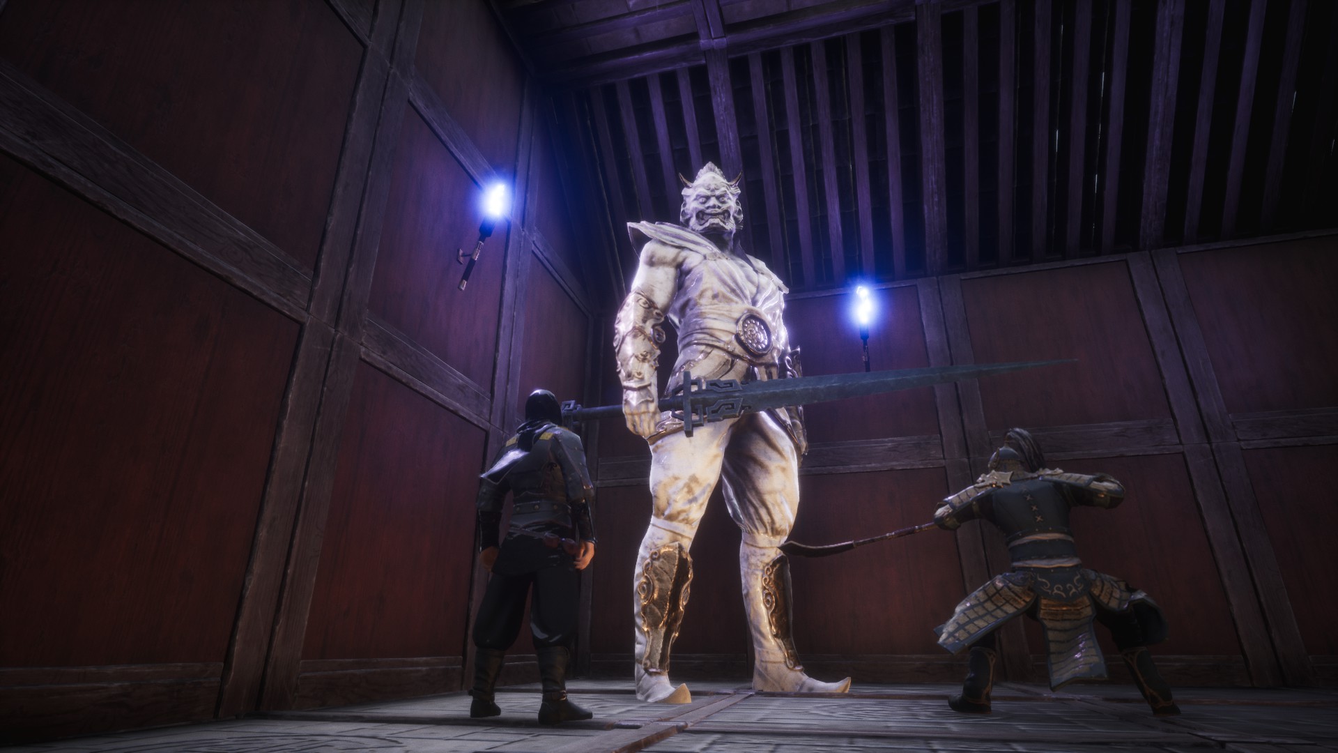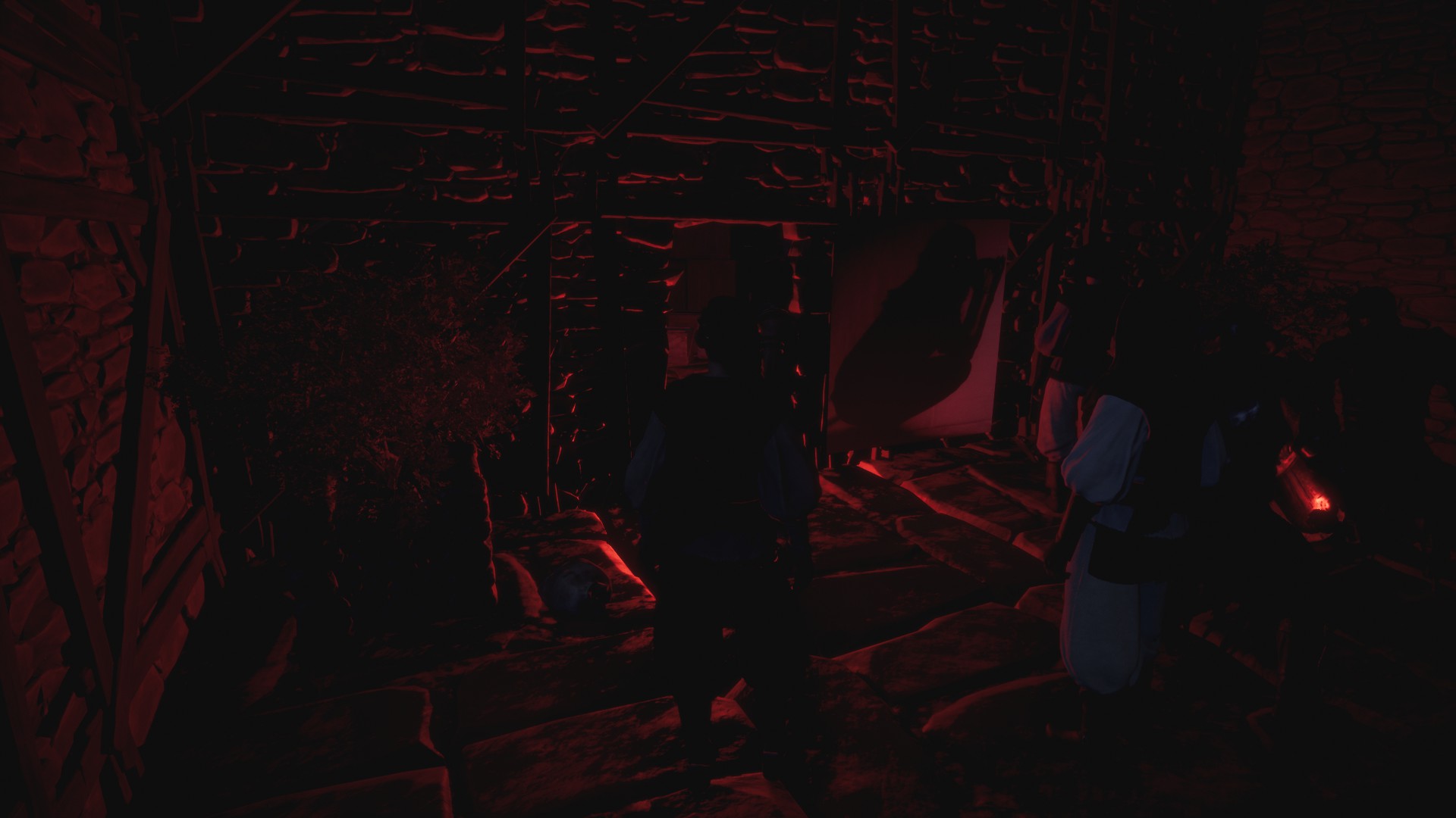 Schließlich klettert der Assassine geschickt die Mauern hoch, hangelt sich an Ranken und Efeu nach oben und bricht oben einige der Dachschindeln heraus, die die Ruine bedecken. Durch das Loch gelangt er hinein, gefolgt von der Schuppigen und der Einbrecherin. Die drei erkunden die obere Etage, entdecken den Raum mit der zerbröselten Statue, in der nur noch das Schwert, kleine Steine und Sand und Staub von ihr zeugt, die Schalen, die brennen. Die Feuerschalen um das Podest lassen sich nun händisch löschen und entflammen, sodass die Barriere sich wieder aufbaut, wächst oder schrumpft, unnötige Spielerei. Die Tür nach aussen lässt sich nicht öffnen - was fehlt, ist der Windstein, den sie nicht haben. Unverrichteter Dinge versuchen sie wieder hoch zur Öffnung des Daches zu klettern, aber die Schuppige scheitert daran. Mit vereinten Kräften, einem Gürtel von oben, Hochstemmen von unten und einem beherzten Sprung gelangt es ihr schließlich hoch, wobei sie oben ausrutscht, herunter gleitet und in den Matsch fällt, der sie über und über besudelt.