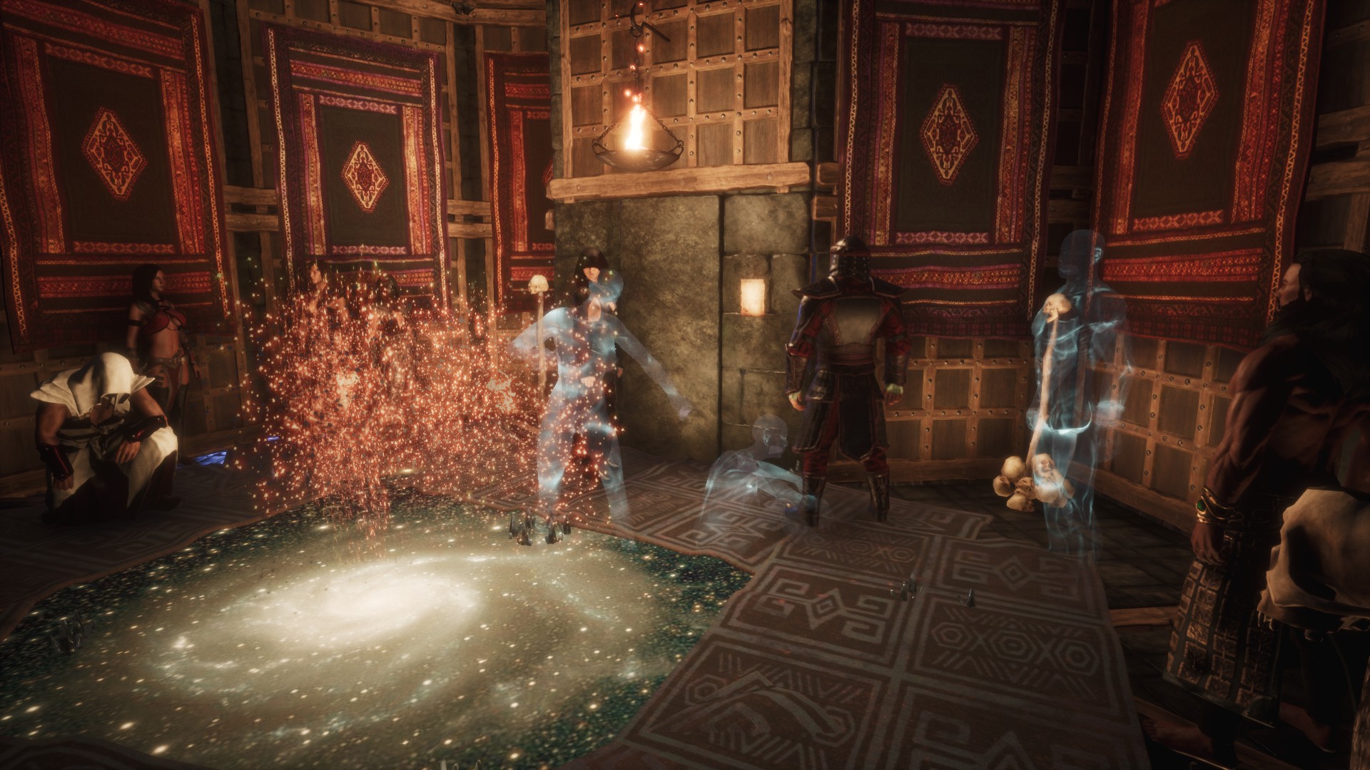 Sie gelangen ins Studierzimmer, nehmen einige der Bücher mit, die Schriftrollen, die sie später studieren wollen, und mustern die geisterhafte Erscheinung, die sich über dem Tisch beugt. Gab die Gestalt anfangs kein sichtbares Zeichen von sich, die Anwesenden bemerkt zu haben, bohrten sich seine Augen nun einzelnd in diejenigen, die vor ihm standen. Mit Namen sprach er sie an, warnte sie, dass sie hier nichts zu suchen hätten und kehrte dann in einen Zustand zurück, in dem er nichts anderes mehr wahrzunehmen schien. Die Khitai konnte ihn berühren und die Schuppige sprach ihn direkt an - doch die Gestalt begann dann sich in Nichts aufzulösen.