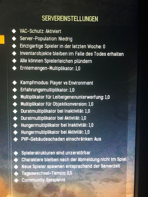 und Hunger und Durst wurde von 1,0 auf 0,5 angepasst. Säuberung ist deaktiviert und Inventar bleibt bei Tod bestehen (geringfügig. Änderungen vorbehalten)- PVE, später auch über Event-Planungen Aktivierung von PVE-Konflikt möglich