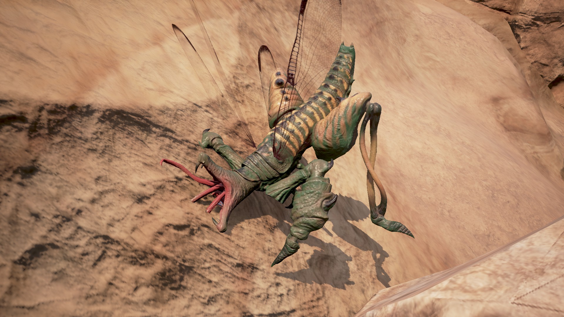 | Der Angriff der Heuschrecke vergiftet euch, der Schaden tickt mehrere Sekunden lang. Wenn möglich, greife sie mit Fernkampf statt Nahkampfwaffen an. |