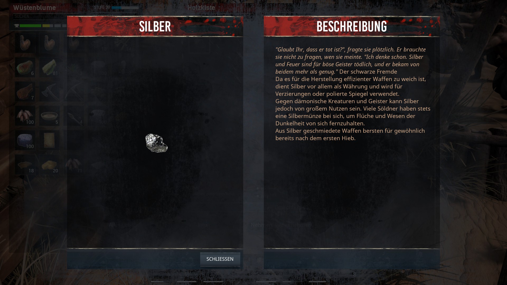 Silber ist eine Ressource in Conan Exiles conanexiles.zone/attachment/254/ Die Ressource Silber kann aktuell sehr selten in Kisten gefunden werden. Typ: Ressource Stufe: HochwertigStapelgröße: 100 Gewicht: 0.05 ID: 11052 conanexiles.zone/attachment/723/conanexiles.zone/attachment/814/