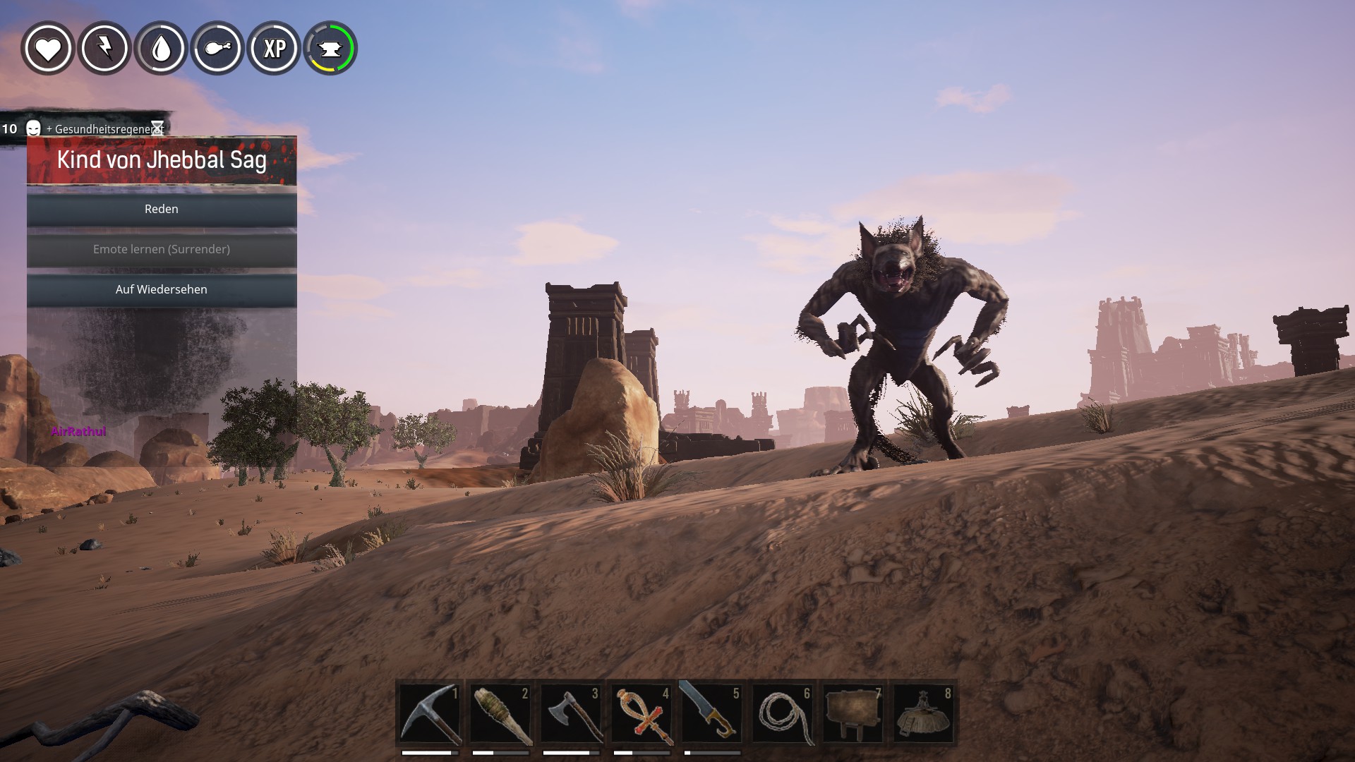 Das Kind von Jhebbal Sag sieht aus wie eine mächtige Werhyäne, scheint jedoch relativ freundlich. Es lehrt das Ergeben-Emote |