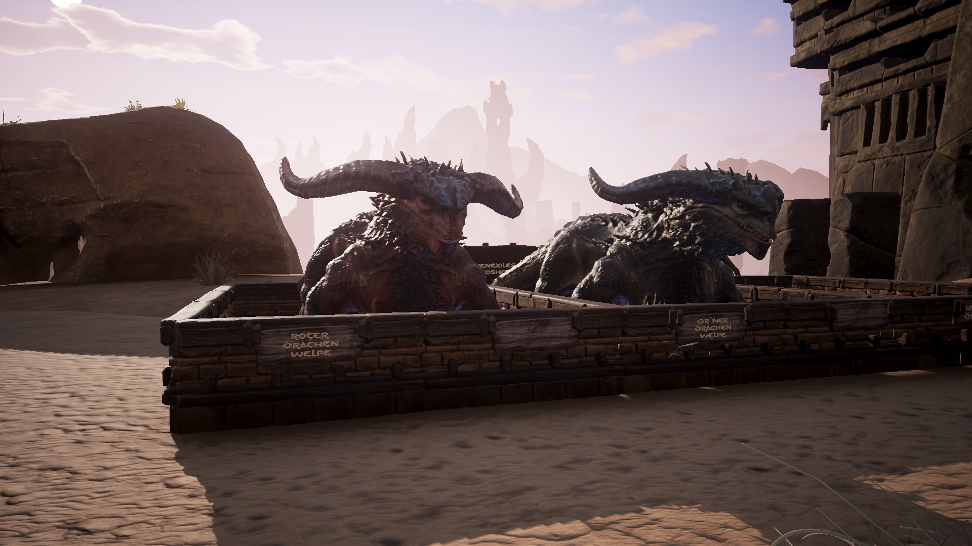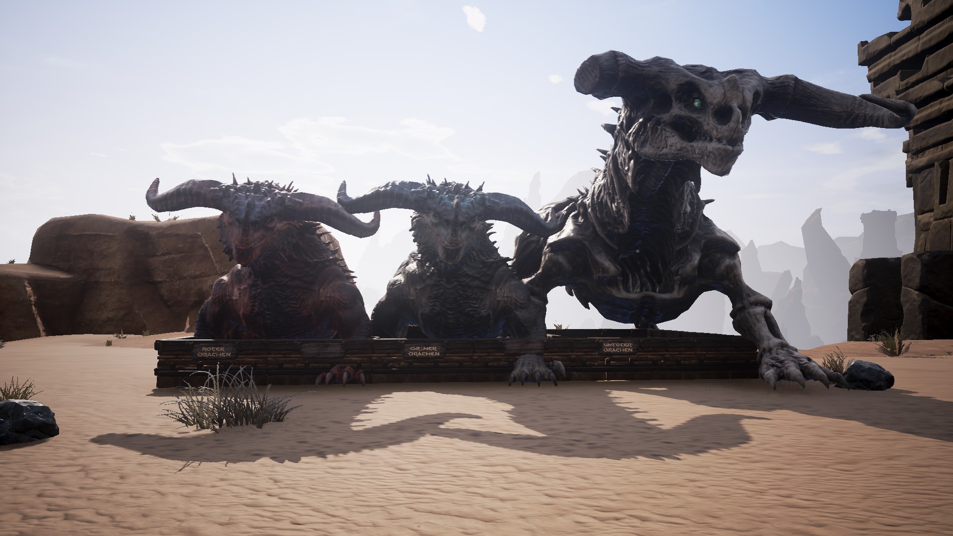Viel ist über die Drachen bislang nicht bekannt. Sie sind die stärksten Kreaturen in der Welt von Conan Exiles. Den roten Drachen findet ihr nördlich der Stadt der Reliquienjäger. Viele grüne Drachen findet ihr in der Verfluchten Stadt. Den Untoten Drachen in den Ruinen des Untoten-Drachen. |