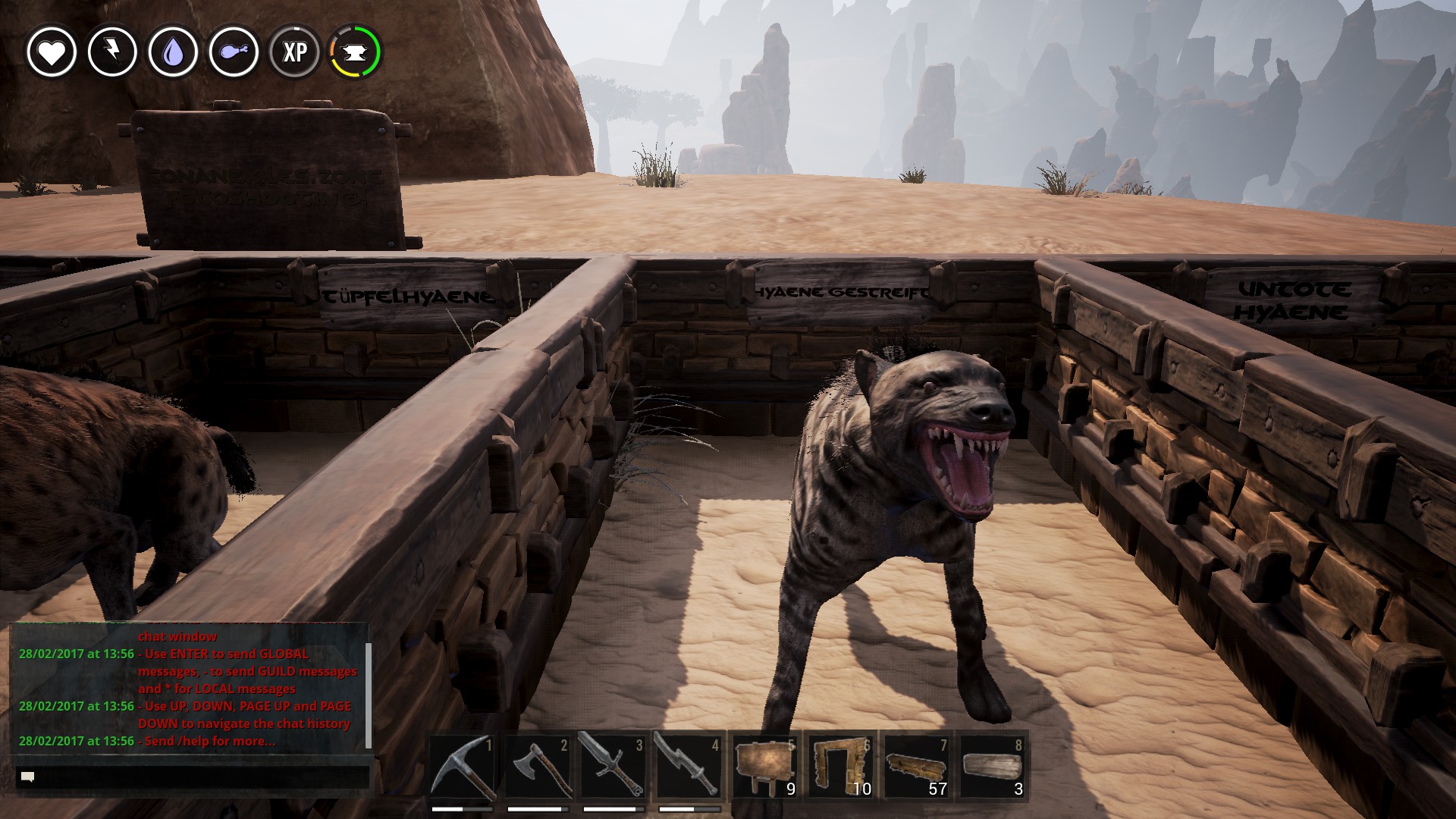 | Die Hyäne ist eine häufige Kreatur in Conan Exiles. Sobald der Spieler ein Steinschwert bekommt, kann man mindestens eine Hyäne abwehren, ohne zu sterben. Allerdings sind Hyänen Rudeltiere und könnten in Gruppen angreifen, vor allem im frühen Spiel ist es daher besser wegzulaufen, da sie einen verkrüppeln, wenn man bleibt und kämpft. |