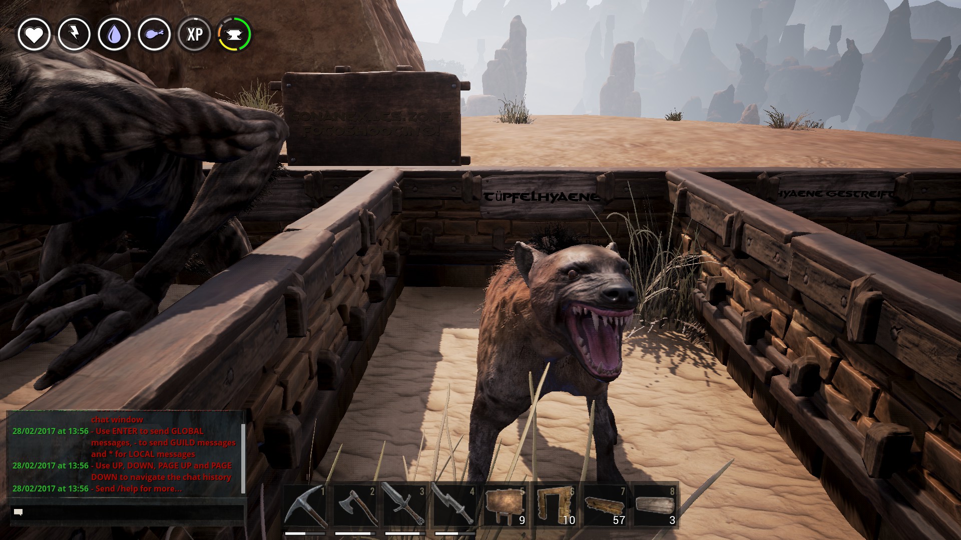 | Die Hyäne ist eine häufige Kreatur in Conan Exiles. Sobald der Spieler ein Steinschwert bekommt, kann man mindestens eine Hyäne abwehren, ohne zu sterben. Allerdings sind Hyänen Rudeltiere und könnten in Gruppen angreifen, vor allem im frühen Spiel ist es daher besser wegzulaufen, da sie einen verkrüppeln, wenn man bleibt und kämpft. |
