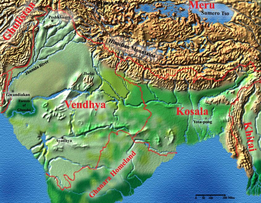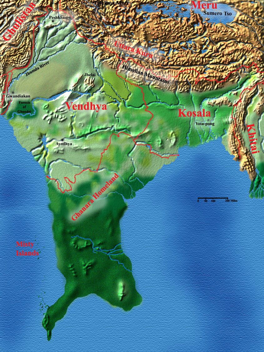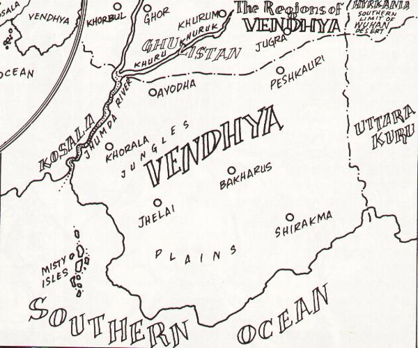 Kambuja. Im Nordosten, jenseits der Berge und tiefen Dschungel, liegt Khitai. Vendhyen hat trotz seiner zahlreichen Bewohner Gebiete mit schier undurchdringlichen, wie auch gefährlichen Urwäldern, aus deren Schatten nur wenige Abenteurer zurückgekehrt sind. Es ist in Hyboria weithin bekannt als das Land großer Reichtümer. |
