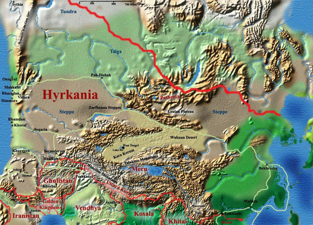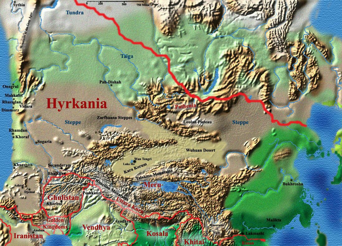 | Das Land der Wölfe, Dämonen und Zauberer mit vielen Steppen und Nadelwäldern. Hyrkanien liegt östlich des Vilayet-Meeres, westlich von Khitai und nördlich von Vendhyen und Meru.