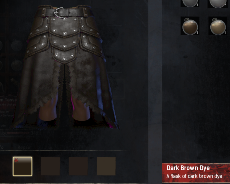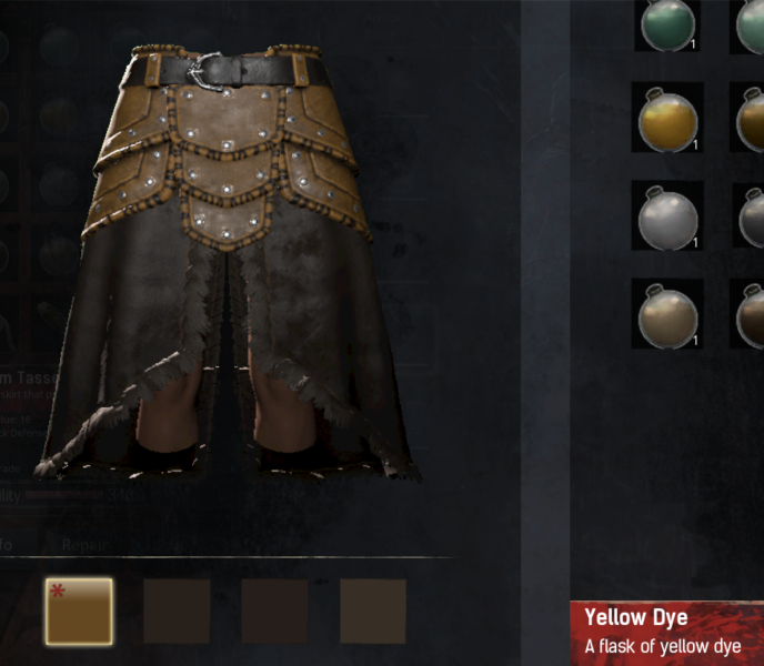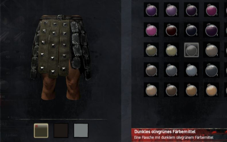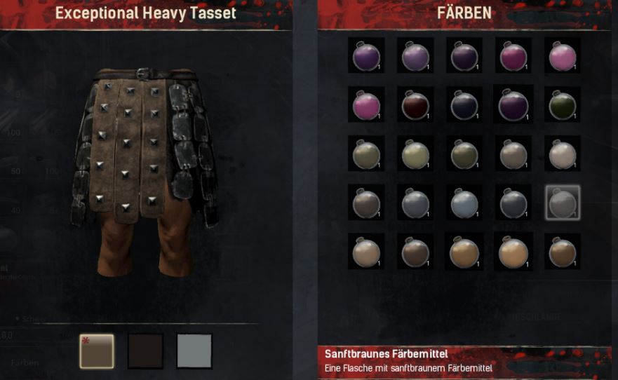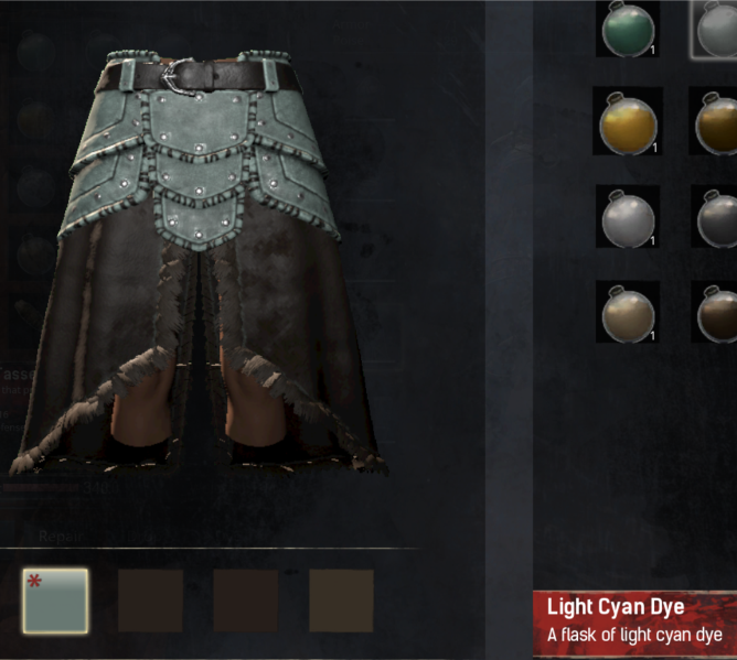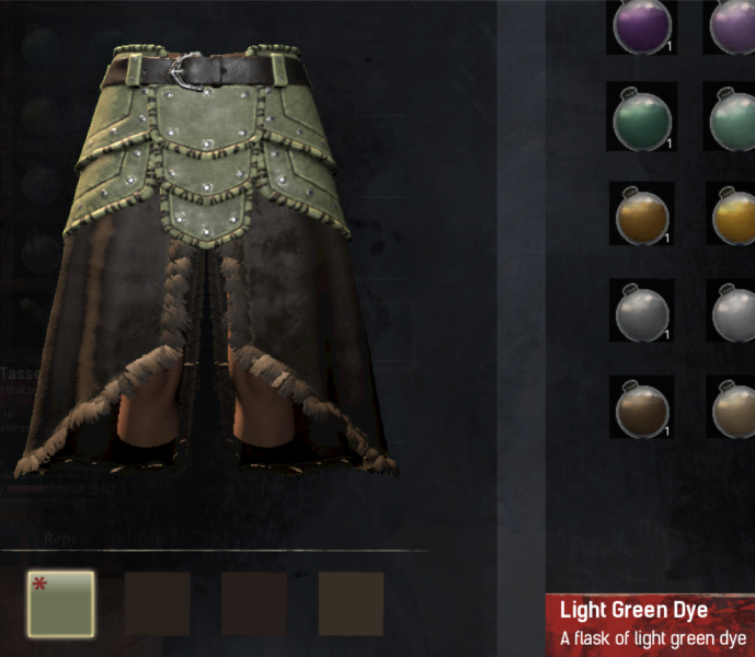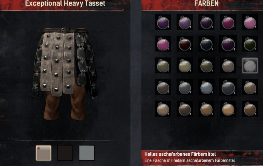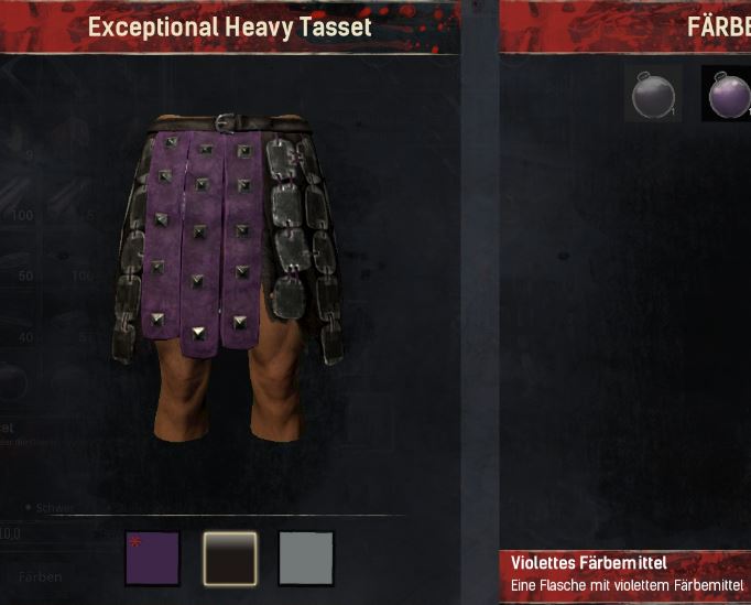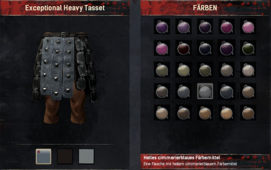 | Färbemittel wird Im Feuerschalen-Kessel hergestellt. Dazu müsst ihr neben einer mit Wasser gefüllten Glasflasche noch entsprechende Zutaten, wie zum Beispiel Insekten, oder Pflanzen hinzugeben. Durch dunkle bzw. helle Farbzusätze erhaltet ihr andere Farbtöne. Die Herstellungszeit beträgt pro Färbemittel 20 Sekunden. | ||