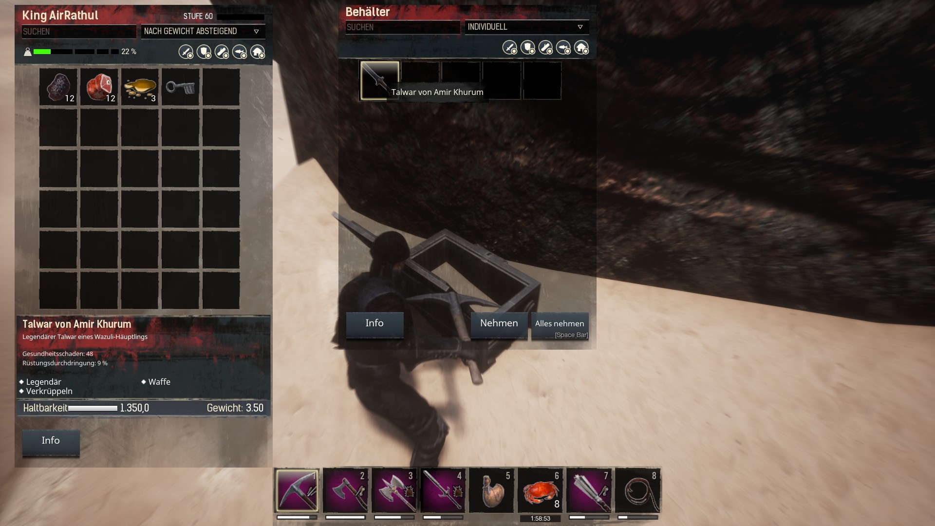 | Das Talwar von Amir Khurum ist eine Waffe in Conan Exiles, sie kann in legendären Kisten gefunden werden. Diese können meist hinter Weltbossen (Krokodil, Spinne, Skorpion, e.t.c.) gefunden und mit einem Dietrich geöffnet werden. |