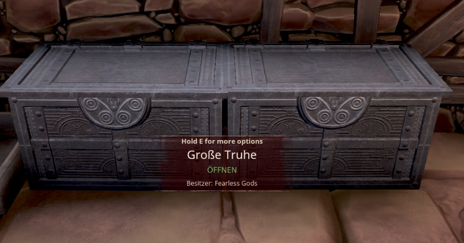 Eine große Truhe ist ein Möbelstück in Conan Exiles zum Aufbewahren von Gegenständen. Eine große Truhe zum Aufbewahren von Gegenständen. Handgefertigt.Kosten: 60 Geformtes Holz, 20 EisenverstärkungSie hat 45 Fächer. Voraussetzung: Level 20, 5 Wissenspunkte,HandwerksgeselleID: 80852
